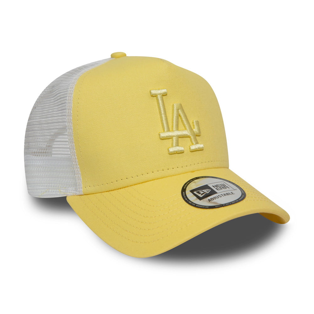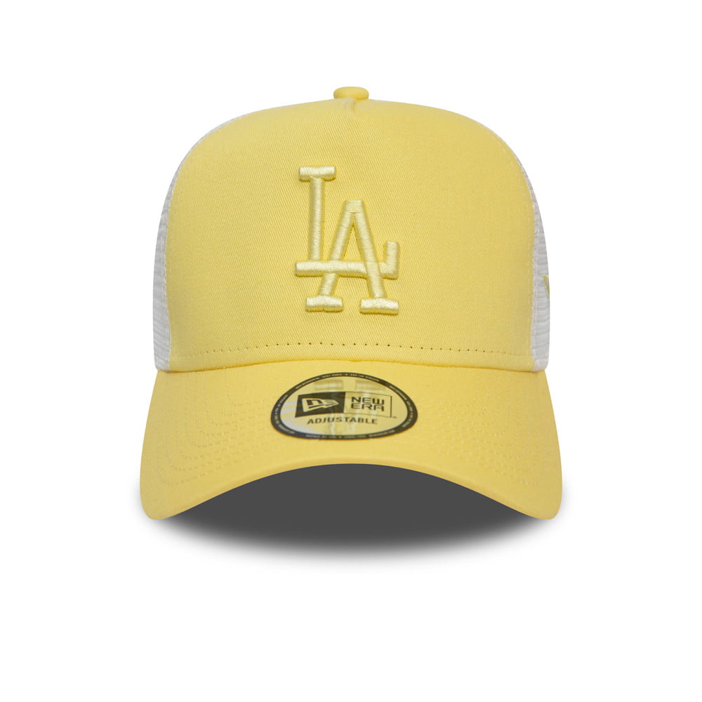 New Era L.A. Dodgers MLB League Essential Trucker Cap in light yellow. The cap features a cotton front with the team logo embroidered in the middle. The New Era flag is embroidered on the side. There is an adjustable snap at the back of the hat for a great fit.