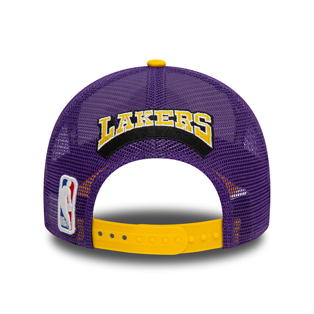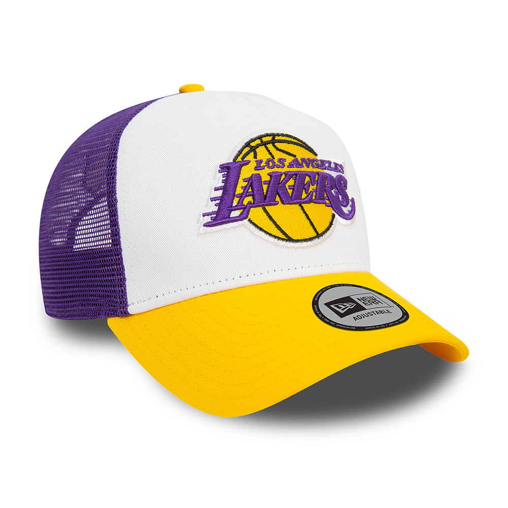 The New Era NBA Rear Arch L.A. Lakers A-Frame Trucker Cap in white-yellow-purple features the team logo embroidered on the structured cotton front and the New Era flag embroidered on the left side. The team name is embroidered above the adjustable snap and the NBA logo is on its left.