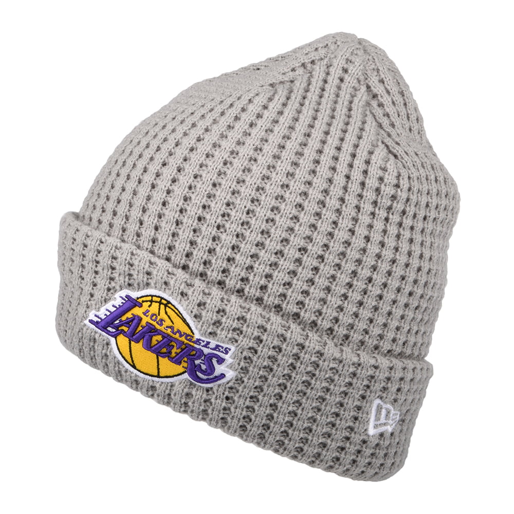 Here is the New Era Los Angeles Lakers NBA Team Waffle Knit Beanie Hat in grey. This winter beanie features the teams logo on a patch sewn to the front. There is a New Era flag embroidered on the side of the hat and it is double layered for extra warmth. A great winter hat for every NBA fan.