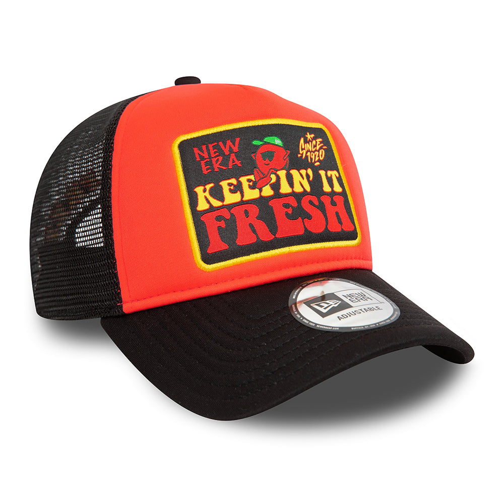 The NE Patch A-Frame Cap in orange-black is the new trucker Cap from New Era. Instead of the usual sport team logo, this cap features a New Era patch sewn on the padded front and the New Era flag embroidered on the left. A "KEEPIN' IT FRESH" embroidery can be found above the adjustable snap at the back.