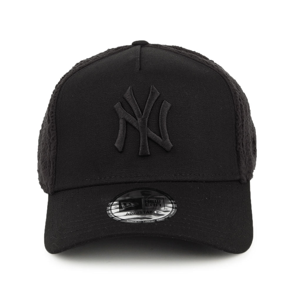 New Era New York Yankees MLB Sherpa Trucker Cap in black. This unique winter trucker style has a cotton front and fleece sides and back. This is a great warm style perfect for the colder months of the year.