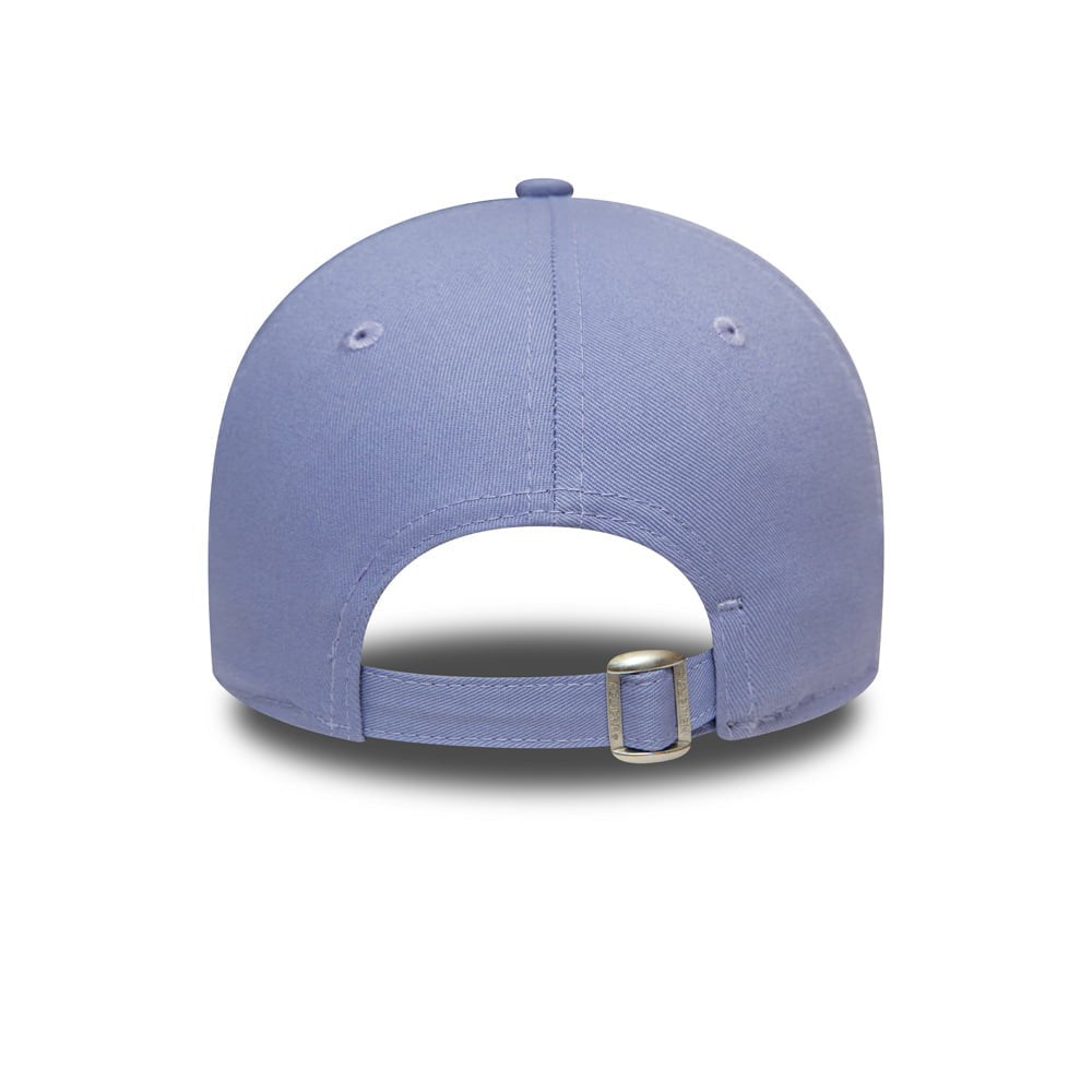 This is the New Era Women's 9FORTY MLB League Essential New York Yankees Baseball Cap in lavender-pink. The team's logo is embroidered on the structured front of the cap and the New Era flag is embroidered on the left side. The six panel cap is made of 100% cotton and features breathable eyelets with a curved visor and button on top. The open back has an adjustable cotton strap with metal buckle so the hat fits many sizes.