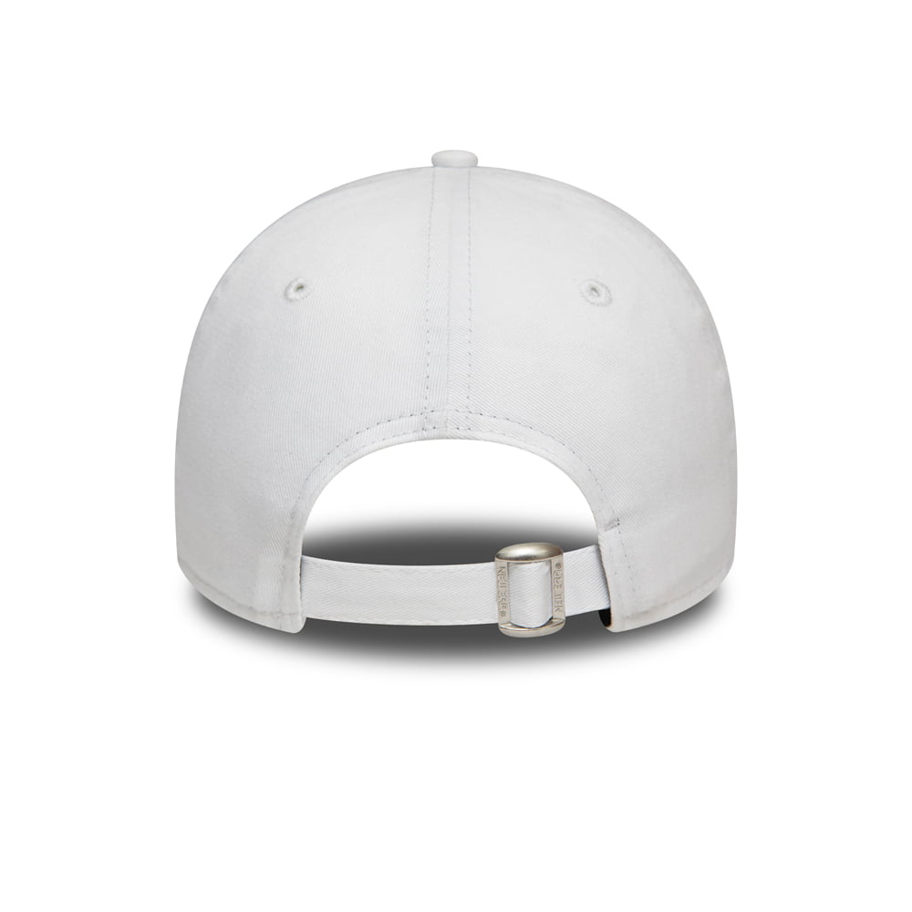 This is the New Era Women's 9FORTY MLB League Essential New York Yankees Baseball Cap in white. The team's logo is embroidered on the structured front of the cap and the New Era flag is embroidered on the left side. The six panel cap is made of 100% cotton and features breathable eyelets with a curved visor and button on top. The open back has an adjustable cotton strap with metal buckle so the hat fits many sizes.