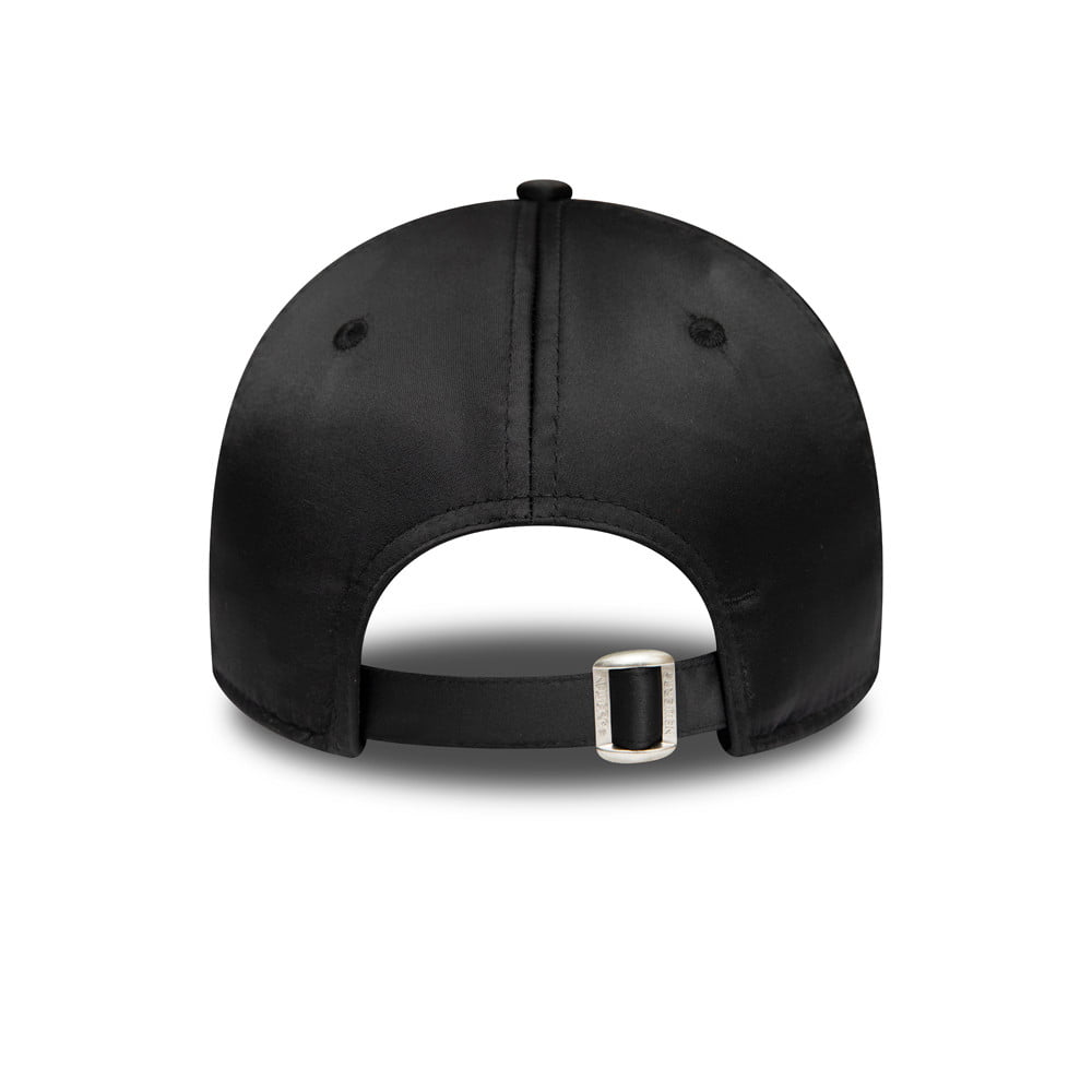 This is the Womens 9FORTY New York Yankees MLB Satin Baseball Cap in black from New Era. The team logo is featured on the front and the New Era® flag is embroidered on the left side of the cap. The six panel cap features breathable eyelets with a curved visor and button at top. The open back has an adjustable strap with metal buckle so the hat fits many sizes.