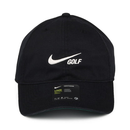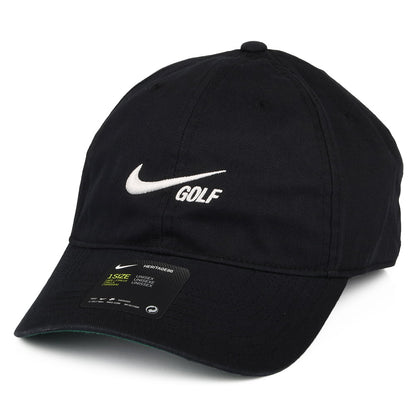Here is the Nike Golf Hats Heritage 86 Washed Solid Baseball Cap in black. Made of 100% cotton, this baseball cap features the Nike Golf logo embroidered on the front of the unstructured crown. There is a Nike Golf flip tag next to the adjustable strap at the back. The perfect hat for a day on the course!