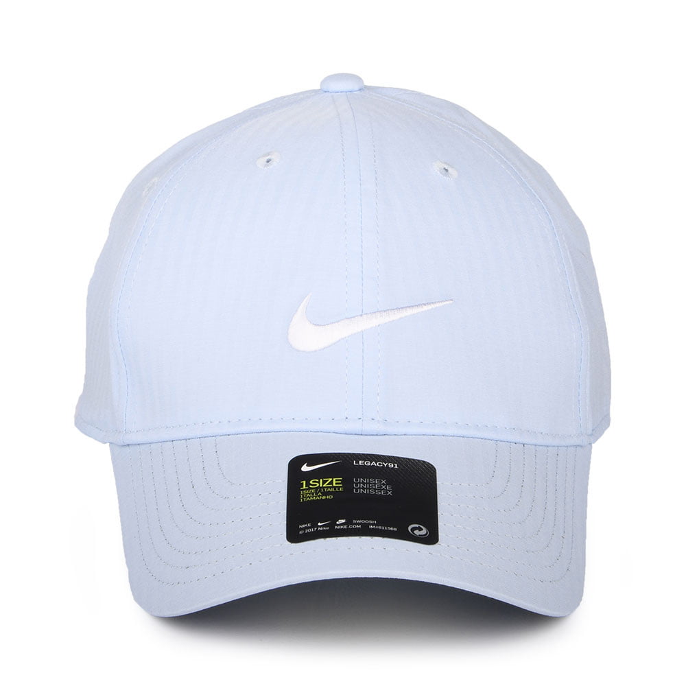 Here is the Nike Golf Hats Legacy 91 Tech Tonal Stripes Baseball Cap in light blue. The cap has the Nike logo embroidered on the structured front and also on the back above the adjustable strap. The whole body of the hat has tonal stripes that are very subtle. This hat features Nikes DRI-FIT technology to assist in keeping you dry while you're out on the course.