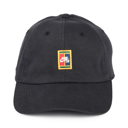 Here is the H86 Community of Sport Baseball Cap in black by Nike SB. This style features the Nike SB logo embroidered on the front of the unstructured crown and a Nike SB tab at the back. The cap is made of a cotton blend and has eyelets on the top for ventilation. At the back is a strap with buckle for easy sizing.