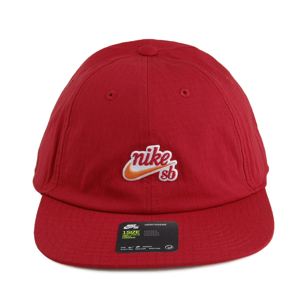 This is the H86 Retro Flat Bill baseball cap in red by Nike SB. This style features a flat brim, the Nike SB logo is embroidered on the front of the cap and there is a Nike SB flip tag at the back. The unstructured crown features eyelets for ventilation. At the back is a two-coloured strap with metal buckle for easy sizing.