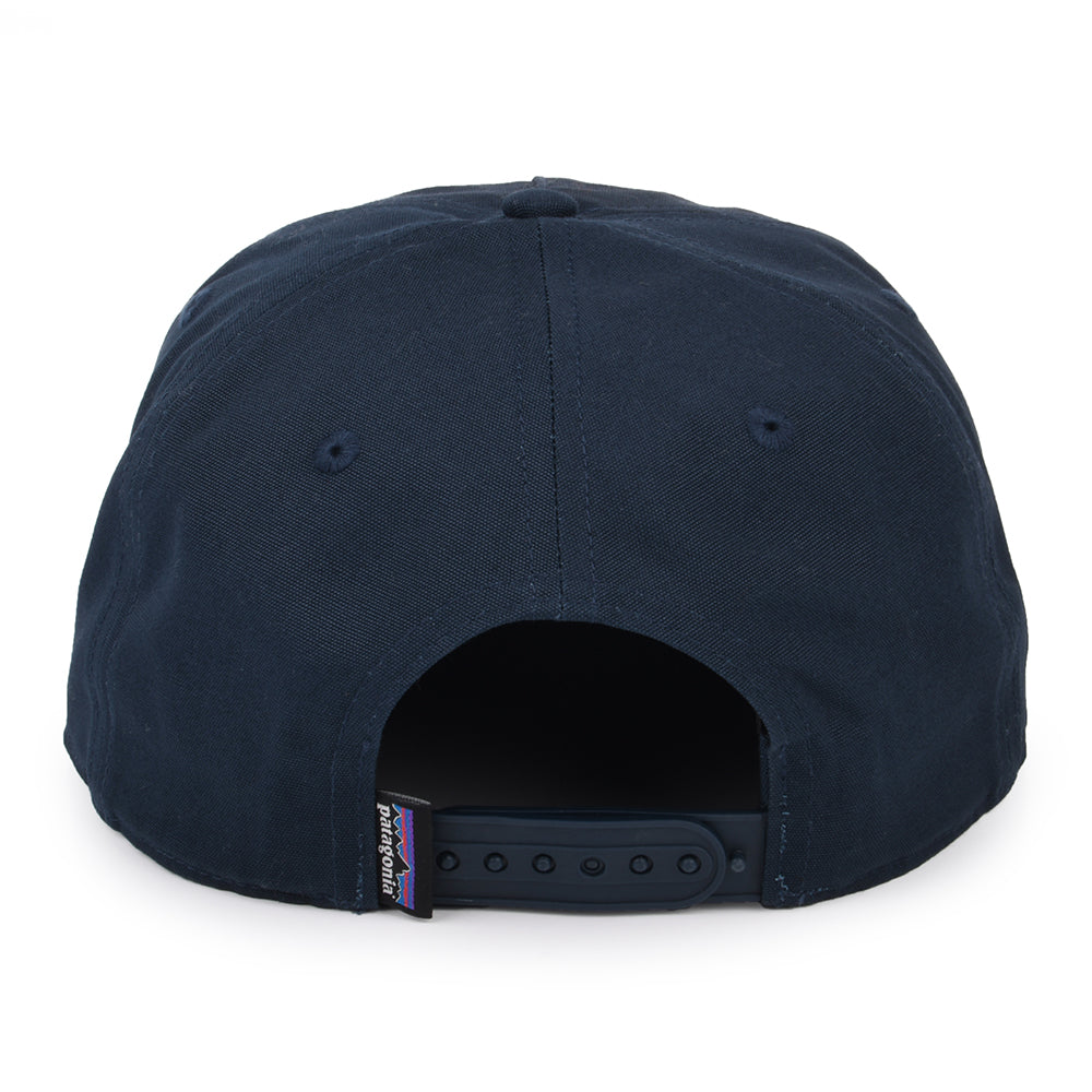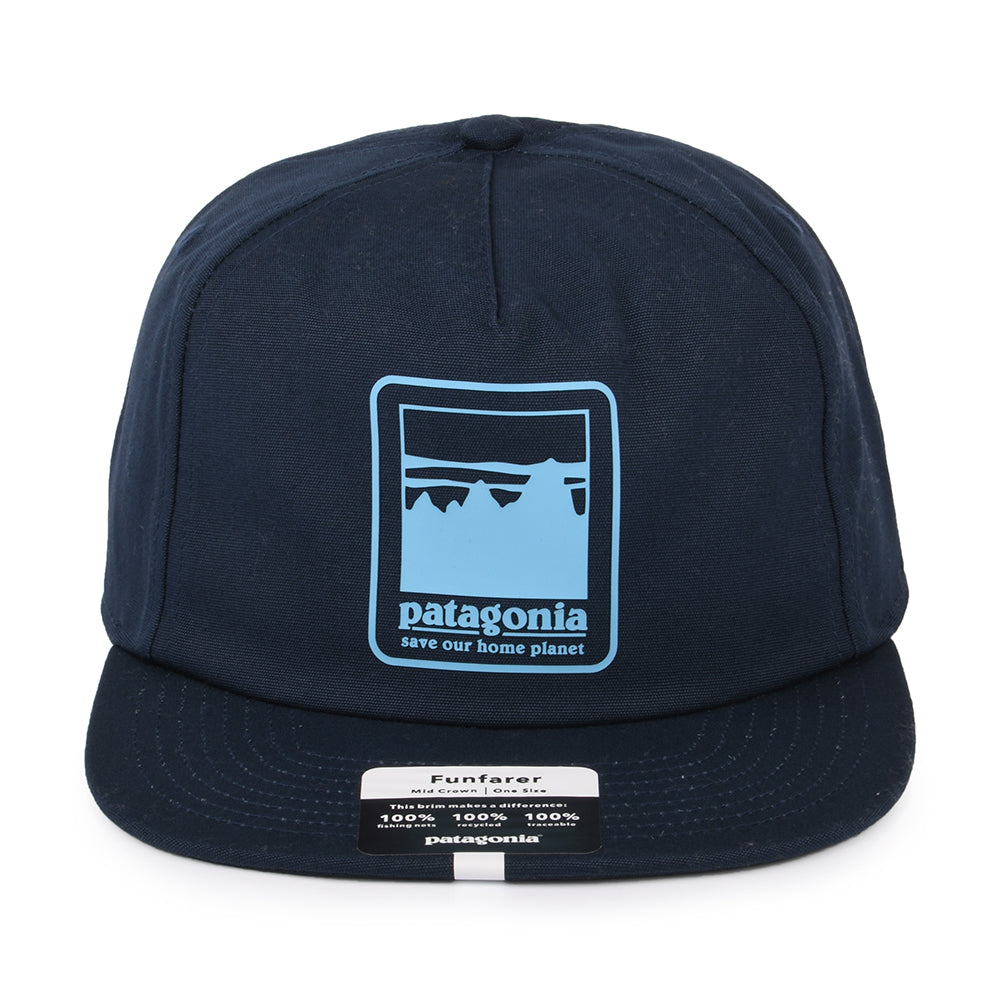 This is the Patagonia Alpine Icon Funfarer Baseball Cap in navy blue. The cap is made of 100% organic cotton and features a Patagonia design on the front. The brim is made of 100% recycled fishing net. There is an adjustable snap at the back of the cap with a Patagonia flip tag attached on the side.