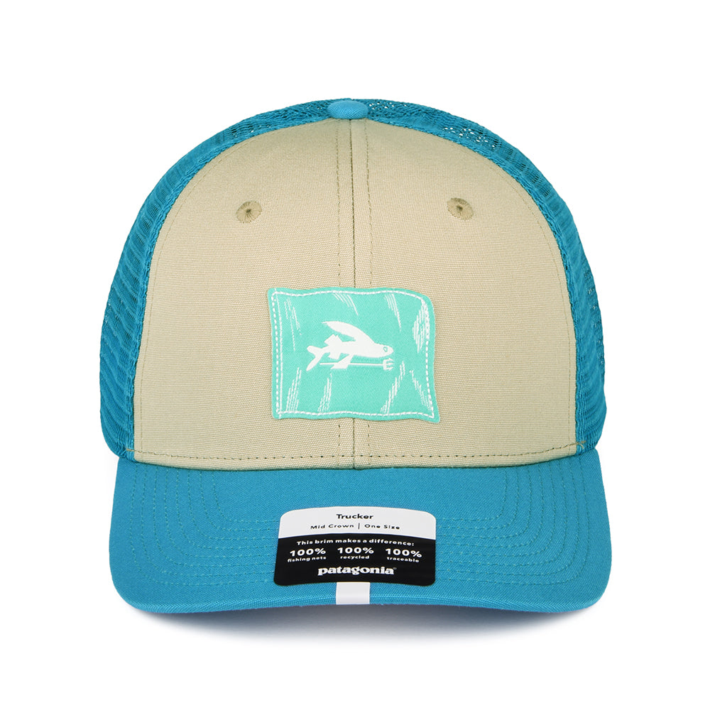 The Fly The Flag Label Trucker Cap in tan-blue features a patch of a flying fish with trident sewn on the structured front panels in organic cotton. The mesh back makes the hat comfortable to wear during the hot summer months. The brim of the cap is made of Bureo's 100% recycled fish nets. A Patagonia flip tag can be found next to the adjustable snap at the back.