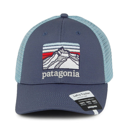The Patagonia Line Logo Ridge LoPro Trucker Cap in blue features an organic cotton canvas front and polyester mesh back, giving it a lightweight feel perfect for the warmer days. It features structured front panels and an adjustable snap at the back. The brim of the cap is made of Bureo's 100% recycled fish nets. The cap is finished with a Patagonia logo embroidery on the front and a Patagonia fliptag at the back next to the snapback.