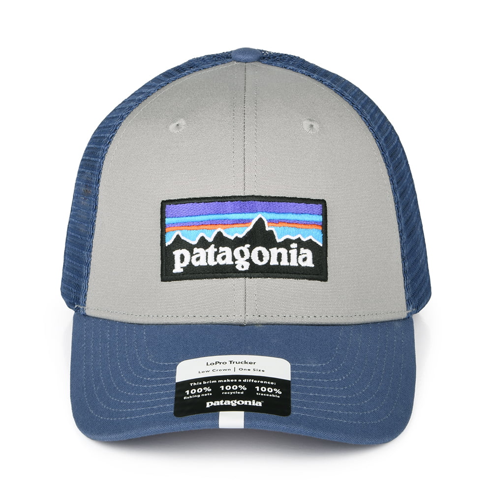 The P-6 Logo Organic Cotton LoPro Trucker Cap in grey-blue features the Patagonia logo embroidered on the structured front panels. The mesh back makes the hat comfortable to wear during the hot summer months. The brim of the cap is made of Bureo's 100% recycled fish nets. A Patagonia fliptag can be found next to the adjustable snap at the back.
