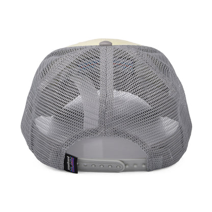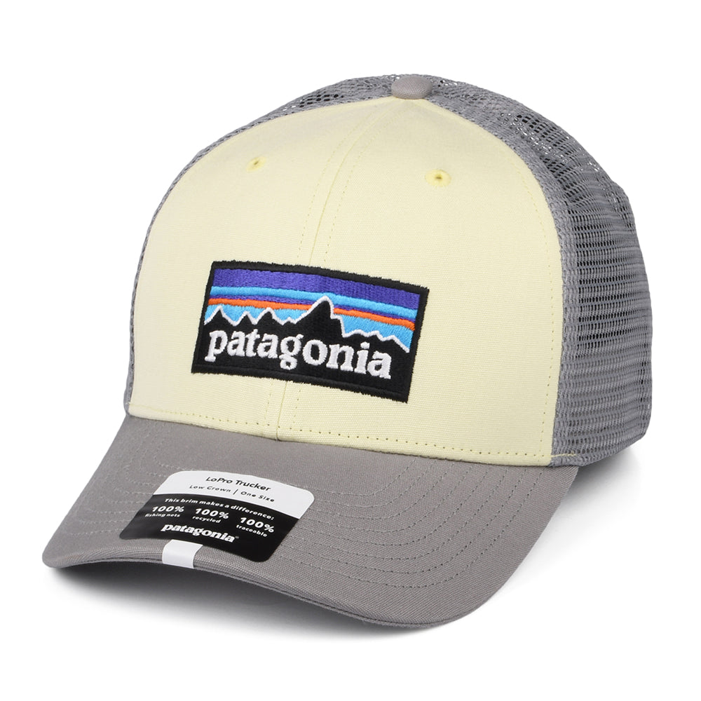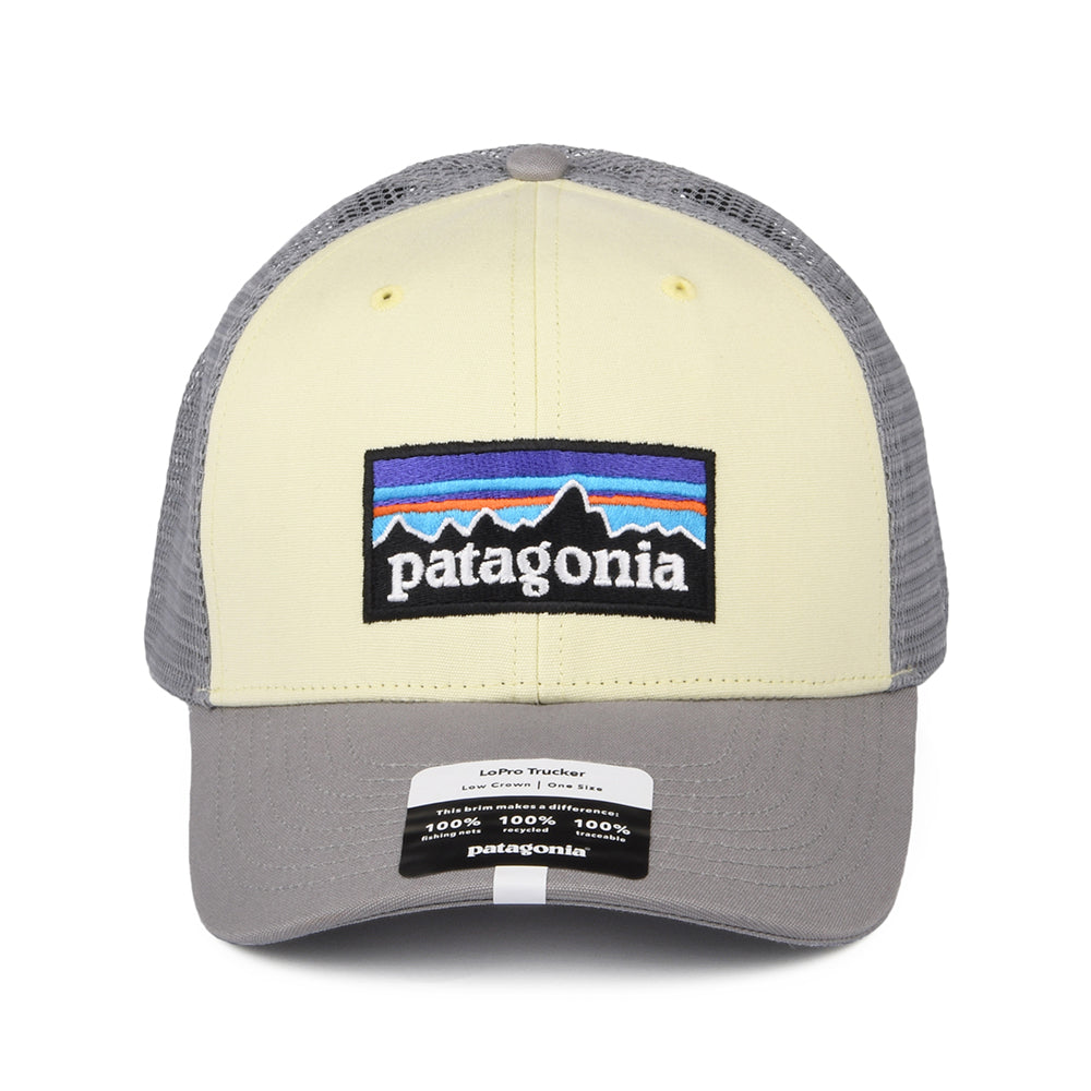 The P-6 Logo Organic Cotton LoPro Trucker Cap in light yellow-light blue features the Patagonia logo embroidered on the structured front panels. The mesh back makes the hat comfortable to wear during the hot summer months. The brim of the cap is made of Bureo's 100% recycled fish nets. A Patagonia fliptag can be found next to the adjustable snap at the back.