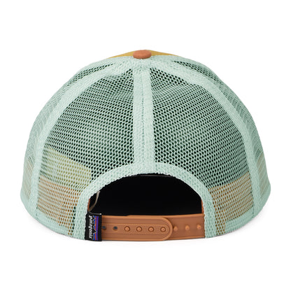 The P-6 Logo Organic Cotton LoPro Trucker Cap in mustard-clay features the Patagonia logo embroidered on the structured front panels. The mesh back makes the hat comfortable to wear during the hot summer months. The brim of the cap is made of Bureo's 100% recycled fish nets. A Patagonia fliptag can be found next to the adjustable snap at the back.