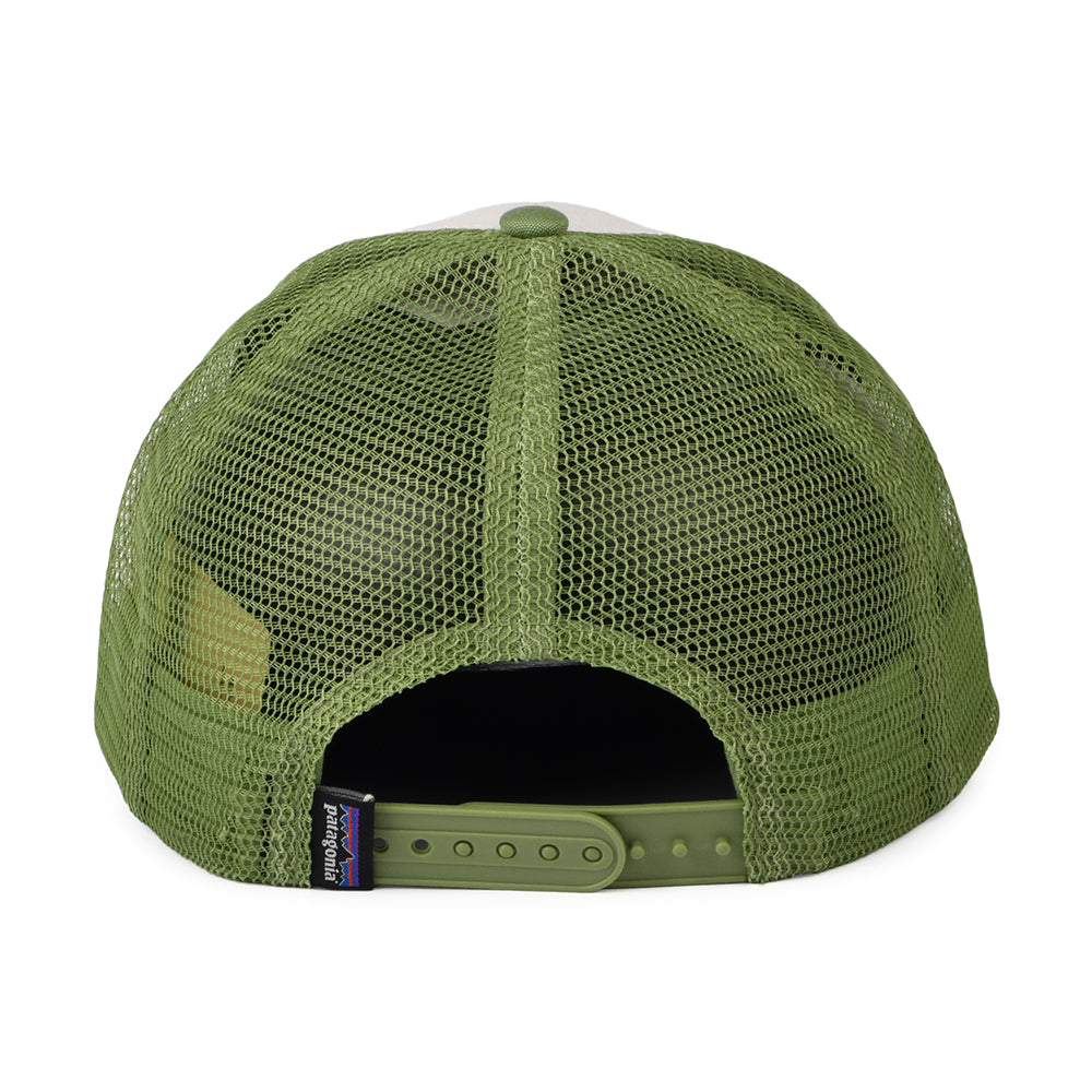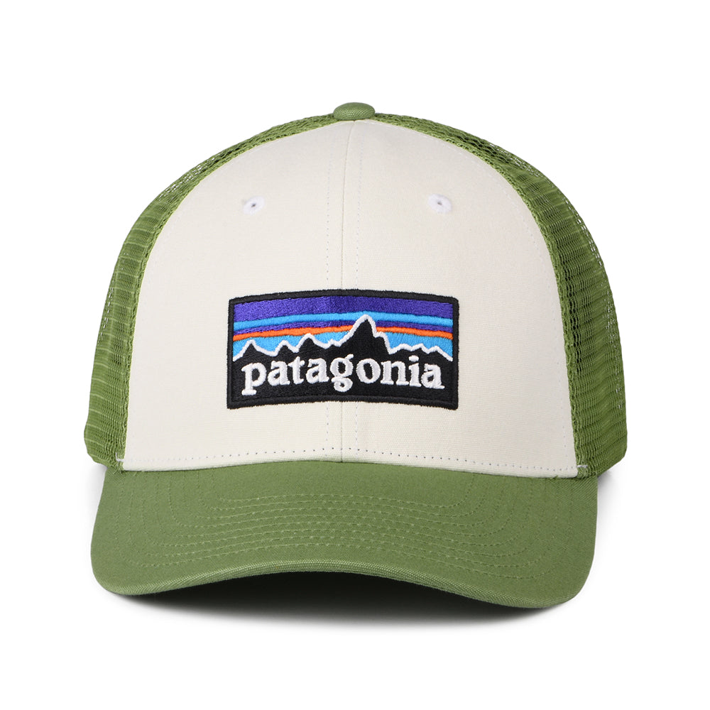 The P-6 Logo Organic Cotton LoPro Trucker Cap in off white-olive features the Patagonia logo embroidered on the structured front panels. The mesh back makes the hat comfortable to wear during the hot summer months. The brim of the cap is made of Bureo's 100% recycled fish nets. A Patagonia fliptag can be found next to the adjustable snap at the back.