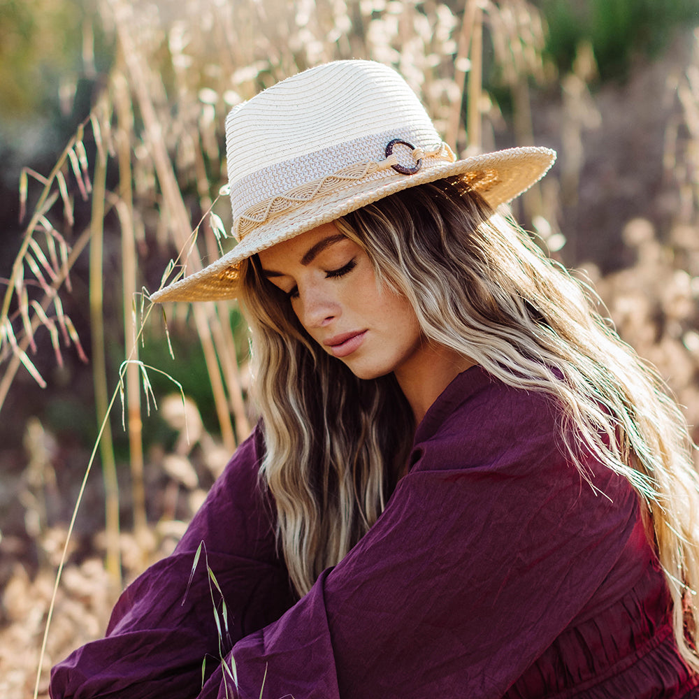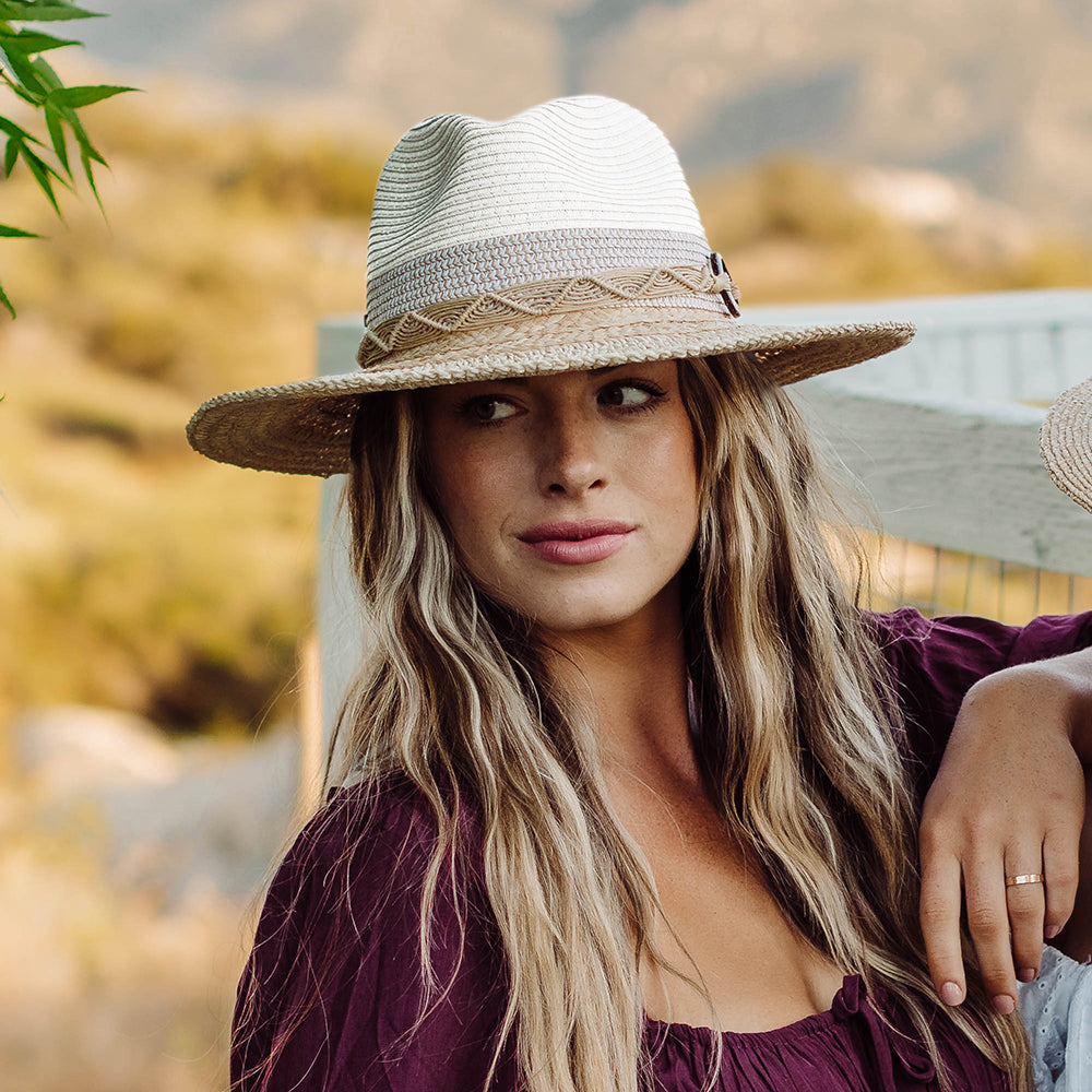 The Scala Alcantara Safari Fedora Hat in white-natural is made of toyo straw and raffia. This lightweight sun hat will be the perfect travelling companion this summer as it is packable. The hat is unlined for additional breathability and there is an adjustable drawstring in the sweatband to ensure a perfect fit. The hat features a unique hat band, a crocheted brim edge, and is finished with a Scala pin on the side.