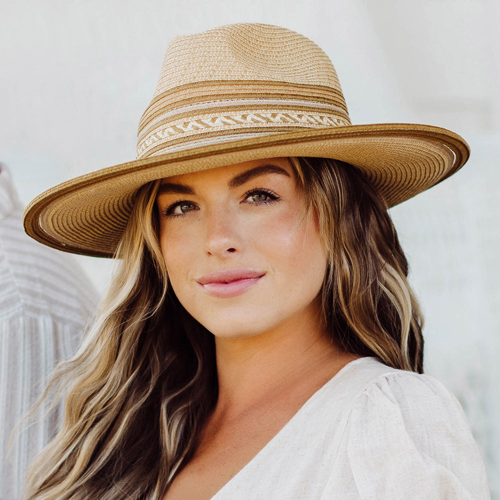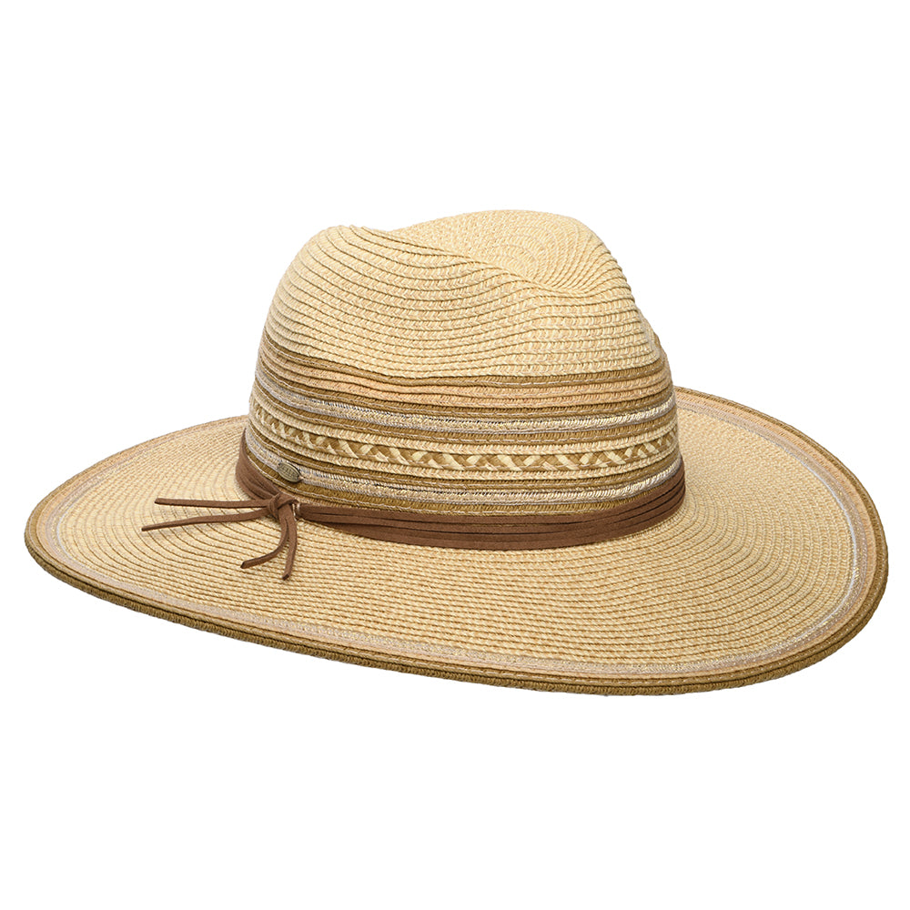 The Scala Alento Safari Fedora Hat in natural is made of toyo straw. This lightweight sun hat will be the perfect companion this summer thanks to its UPF 50+ rating and 9.5cm wide brim. The hat is unlined for additional breathability and there is an adjustable drawstring in the sweatband to ensure a perfect fit. The hat features a faux leather hat band, glamorous metallic threads woven throughout the crown and the edge of the brim, and is finished with a Scala pin on the side.