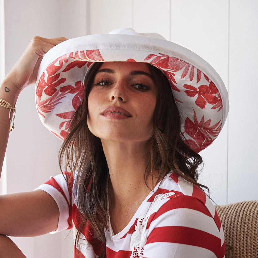 The white Aninata sun hat is made from 100% cotton canvas and easily packs up into a bag or suitcase. The kettle edge brim measures at 9.5cm wide, and when turned down it provides the ultimate sun protection at 12.5cm wide. The 9.5cm high crown is completely lined in a floral patten. Drawstring inside the sweatband allows you to adjust for a perfect fit.