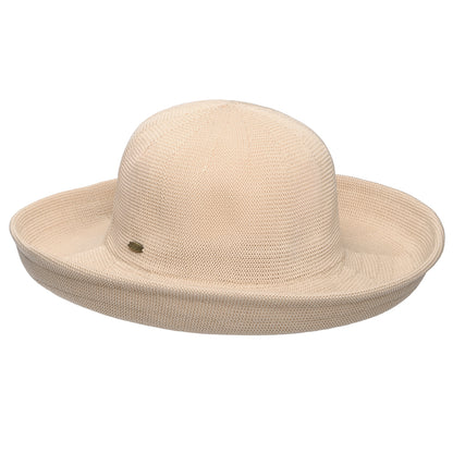 The Scala Anji Upturn Brim Sun Hat in natural is made of a soft poly knit. This lightweight sun hat will be the perfect travelling companion this summer as it is packable and UPF 50+ sun protection rated. The hat is unlined for additional breathability and there is an adjustable drawstring in the sweatband to ensure a perfect fit. The hat features an upturn kettle brim and is finished with a Scala pin on the side.