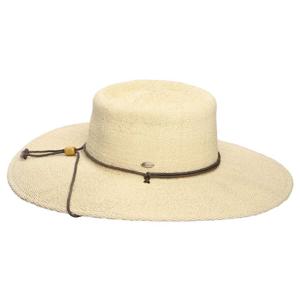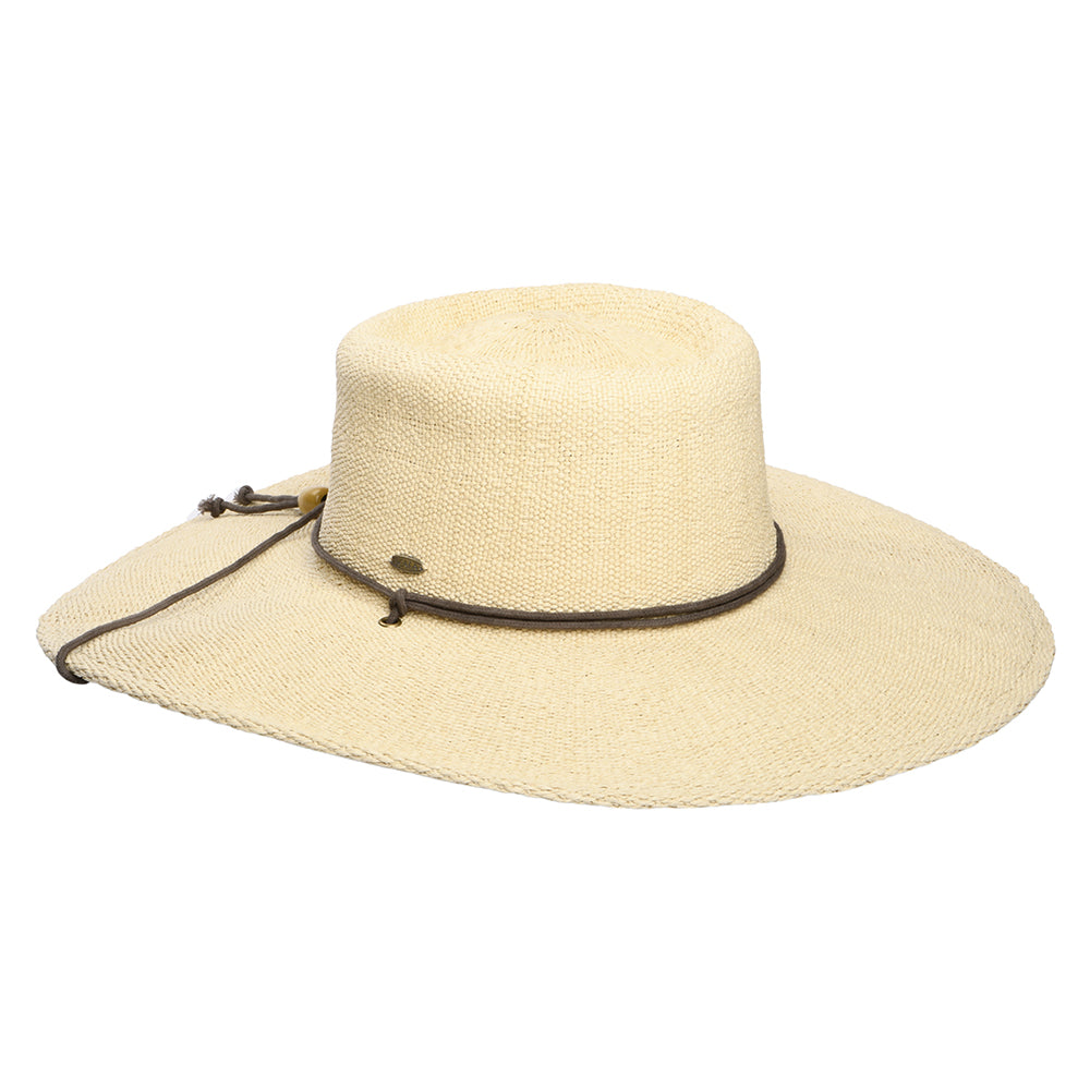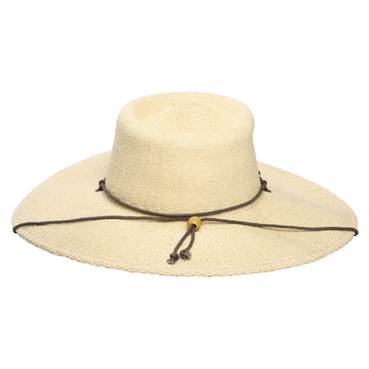 The Scala Shondo Gaucho Hat in natural is made of toyo straw. Also called Bolero Hats, Gaucho Hats were originally worn by cowboys in South America. This lightweight sun hat will be the perfect companion this summer thanks to its UPF 50+ rating and 11.5cm wide brim. The hat is unlined for additional breathability and there is an adjustable drawstring in the sweatband to ensure a perfect fit. The hat features an adjustable chin cord and is finished with a Scala pin on the side.