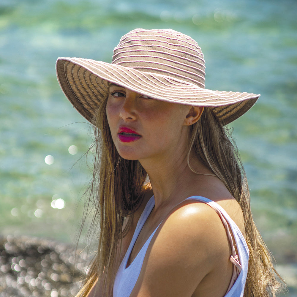 This is the Scala Sonia Wide Brim Sun Hat in khaki. This fantastic summer hat features a lovely wide brim with a rope hat band as a great finishing touch. The hat comes unlined for a comfortable fit during those hot summer days.