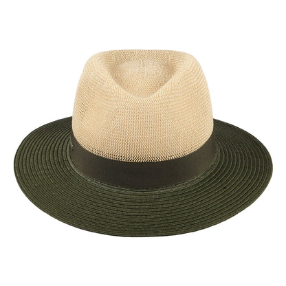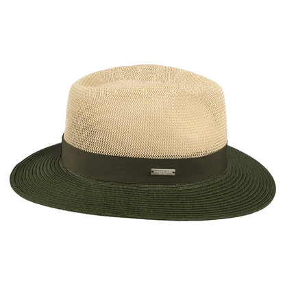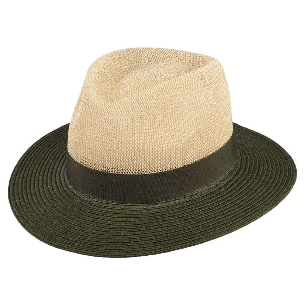 This is the Seeberger Two Tone Toyo Straw Fedora Hat in natural-olive. This summer style is made of a lightweight straw/polyester blend and features a natural straw colour on the crown and an olive brim and hat band. There is a Seeberger pin attached on the side of the hat and it comes unlined for added comfort on those warm summer days.