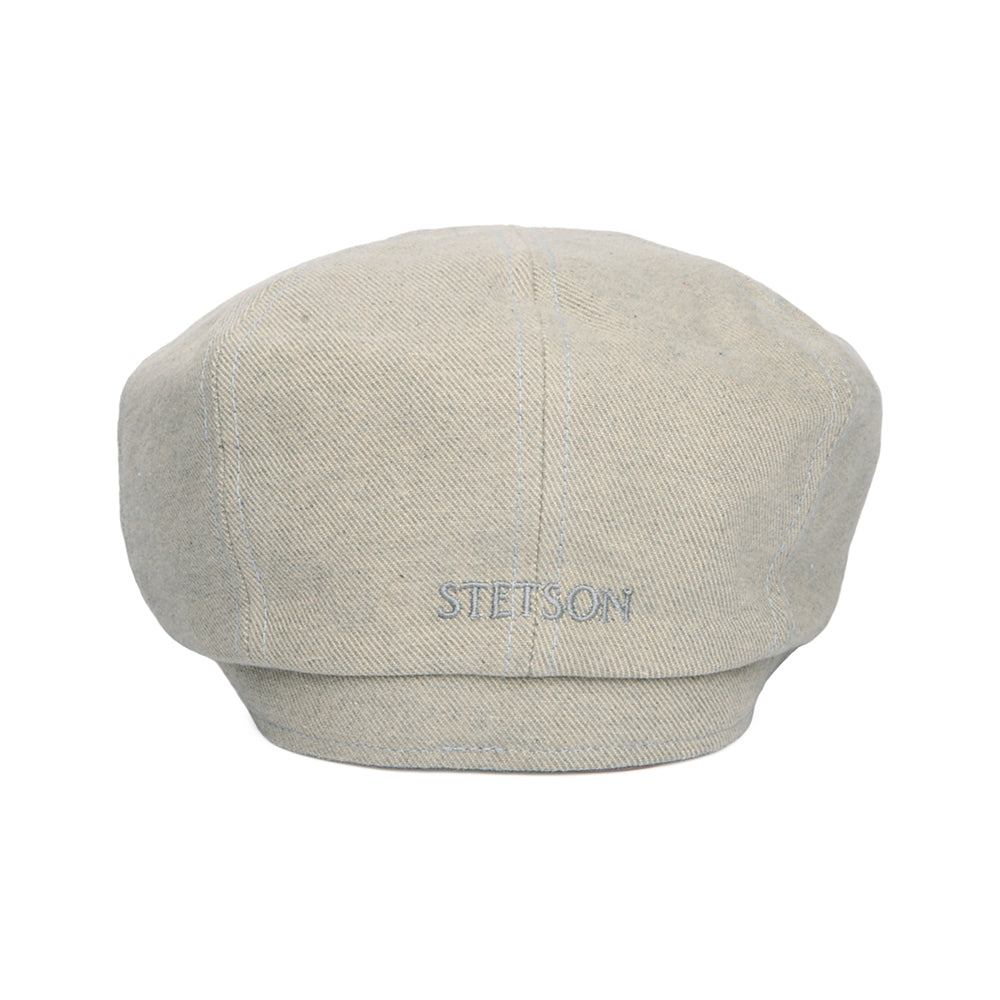 The Stetson Hatteras Cotton Twill Newsboy Cap in beige-light blue is produced climate-neutrally in Europe from an environmentally friendly blend of cotton from sustainable, regenerative cultivation and recycled cotton fibres from clothing, in cooperation with ClimatePartner to reduce CO2 emissions. This great looking hat for everyday wear is perfect throughout the year. The hat has the classic 8/4 shape with the slightly extended brim and Stetson name embroidered at the back.