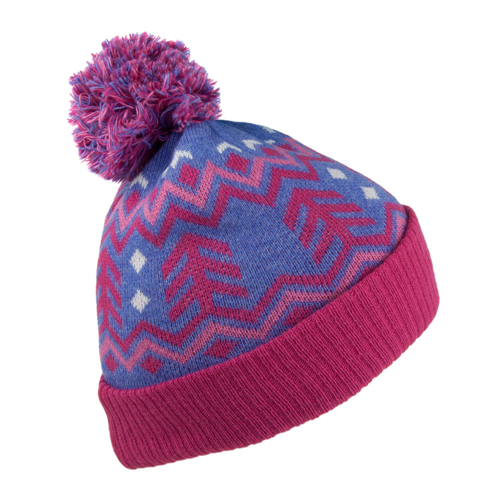 The Sunday Afternoons Kids Jupiter Beanie Hat in pink-purple. This beanie feaures a winter pattern on the crown, a bobble and a rib knit cuff with a Sunday Afternoons fliptag sewn to the side.