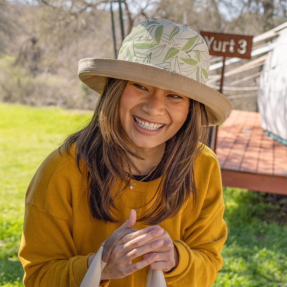 With a downsloping, wired brim that looks sharp up or down, the Natural Blend Kettle in light brown-multi from Sunday Afternoons is two hats in one, with a natural cotton/recycled polyester fabric on the solid side and a 100% recycled polyester on the leaf print side. With a UPF 50+ sun protection rating and PFAS-free durable water repellent finish, this sun hat will protect you against the elements, rain or shine.