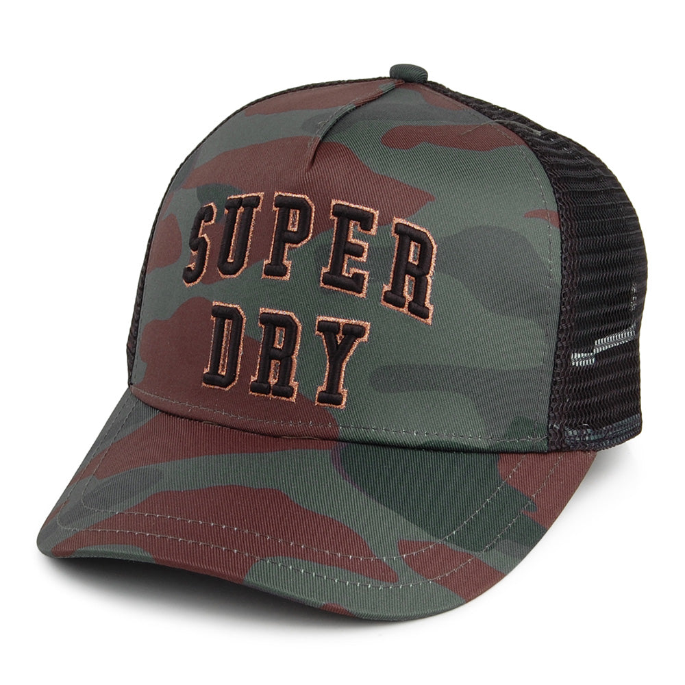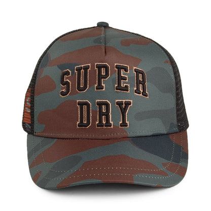 This is the Superdry Hats Trucker Cap in camouflage. This hat has a camouflage front and brim and a black mesh back, which allows great ventilation. The front features a Superdry logo with golden edging. On the back is an adjustable snapback for easy sizing.