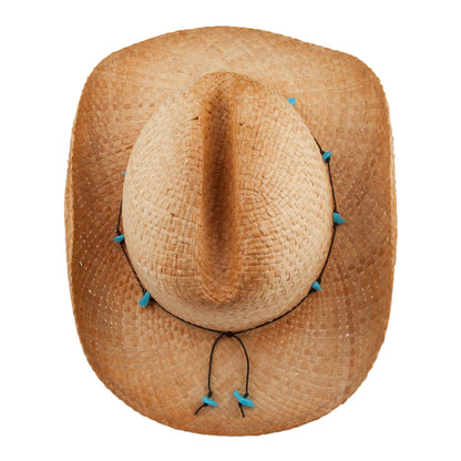 The sur la tête Calamity Cattleman cowboy hat is a great straw western hat. One you can wear with a pair of boots or sandals. The lightweight Raffia straw has been 'tanned' to a warm tea tone. Faux turquoise chips are knotted onto a waxed cord around the crown. The 11.5cm high crown has a 9cm shapeable brim; the wire hidden along the edge of the brim allows for various brim styles. Inner elasticized sweatband.