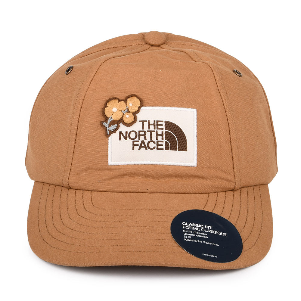 Here is the The North Face Hats Berkeley Baseball Cap in light brown. This cap is unlined and comes with a sweatband made of FlashDry™ fabric which is engineered to wick moisture away from your skin helping to keep you dry, cool and comfortable. The North Face logo and some flowers are embroidered on the front of the unstructured crown. A North Face flip tag is attached next to the adjustable strap at the back of the cap.