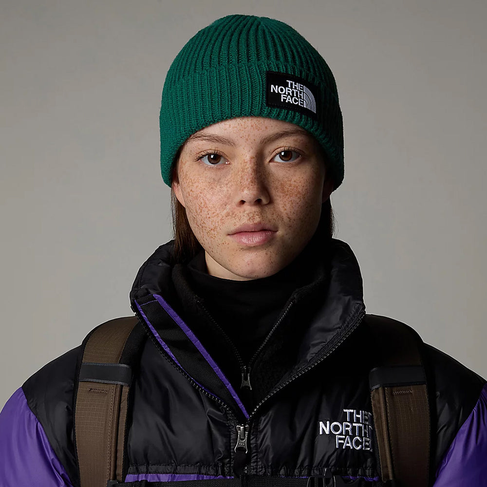 The North Face TNF Logo Box Cuffed Fisherman Beanie Hat in evergreen is a comfortable beanie featuring a North Face patch sewn to the front of the cuff. The beanie is a short fisherman style made of a soft acrylic yarn. Stay warm and look great.