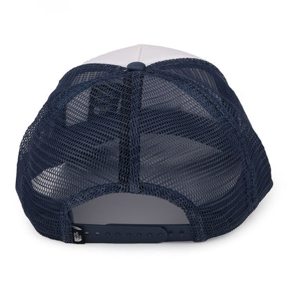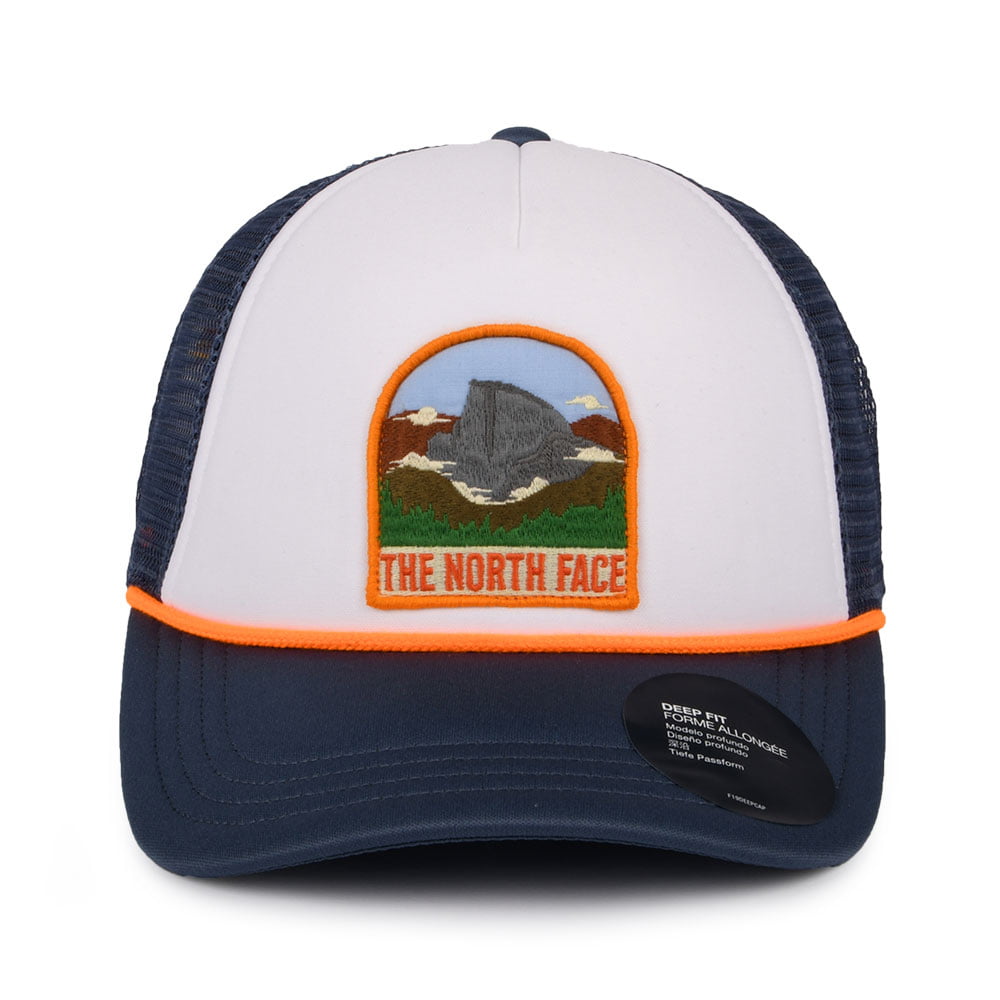 The North Face Valley Trucker Cap in blue-white has a padded front and polyester mesh back. A North Face valley patch is embroidered on the front and the base of the crown is adorned with a rope. There is a North Face flip tag next to the adjustable snap at the back.