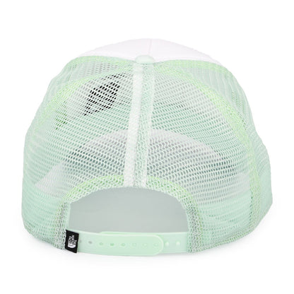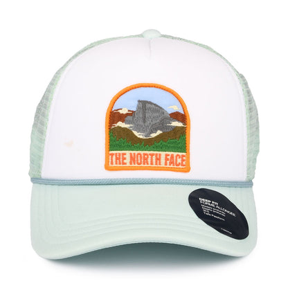 The North Face Valley Trucker Cap in light green-white has a padded front and polyester mesh back. A North Face valley patch is embroidered on the front and the base of the crown is adorned with a rope. There is a North Face flip tag next to the adjustable snap at the back.