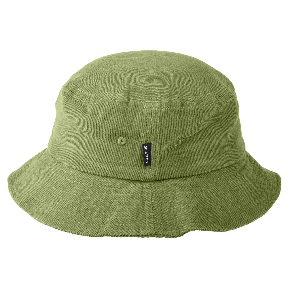 Here is the Quiet Life Hats Corduroy Bucket Hat in olive. This cool corduroy bucket hat features a Quiet Life embroidery on the front and a Quiet Life flip tag on the side. There are eyelets on the sides for breathability and a cotton sweatband inside the hat for comfort.