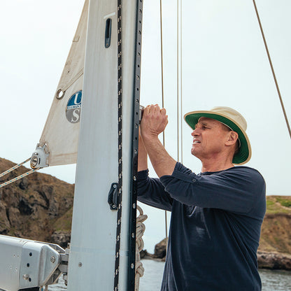 The Tilley LTM5 Airflo Packable Sun Hat in natural is constructed of a durable, water resistant, lightweight and fast drying fabric. Each stitch is lock-stitched, and the poly-cotton thread swells when wet, sealing the needle holes against the rain. Offers UPF50+ sun protection. Airflo Hats incorporate mesh in the crown for extra breathability in hot conditions.