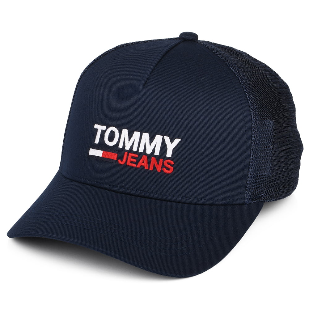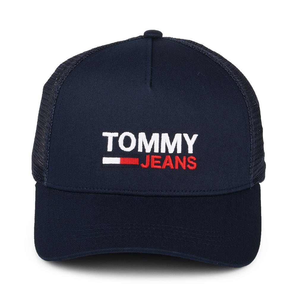 Here is the Tommy Hilfiger Hats TJM Flat Trucker Cap in dark navy. The cap features a structured cotton front with the Tommy Jeans logo embroidered in the middle. The mesh back has an adjustable snap to ensure the perfect fit.