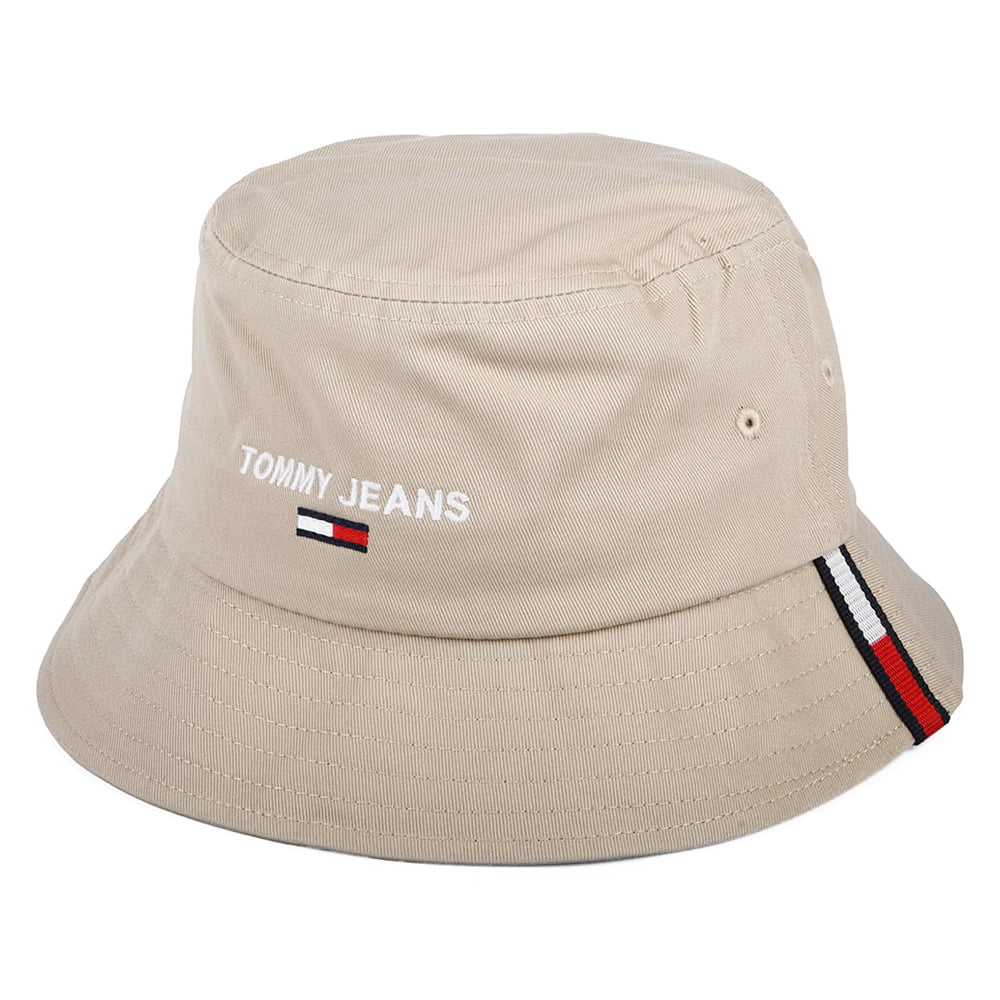 This is the TJM Sport Organic Cotton Bucket Hat in beige from Tommy Hilfiger. This classic bucket hat is made of 100% organic cotton and has the Tommy Jeans logo embroidered on the front and its famous flag boldly featured on the brim. There are two eyelets on each side to encourage ventilation. The inside is unlined and features a cotton sweatband for extra comfort.