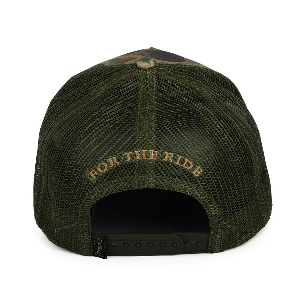 This is the Triumph Motorcycles Hunter Trucker Cap in camouflage. The cap features Triumph Motorcycles embroidered on the front. The mesh back has "For the Ride" embroidered and a Triumph flip tag. There is an adjustable snap to ensure a perfect fit.