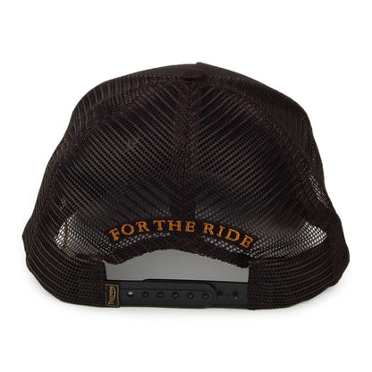 This is the Triumph Motorcycles Kerosene Vintage Logo Trucker Cap in black-gold. The cap features an vintage Triumph logo on the front of a classic trucker cap style. The front panel and brim are cotton and the mesh back is polyester. There is an adjustable snap at the back of the hat for a great fit.