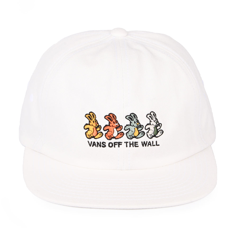 The Peace of Mind Baseball cap in white from Vans is made of 100% cotton. It features a unique artwork and a Vans Off The Wall embroidery on the unstructured front. A Vans flip tag can be found next to the adjustable strap at the back of the cap. The brim is flat and there are eyelets on the sides of the cap for more breathability.