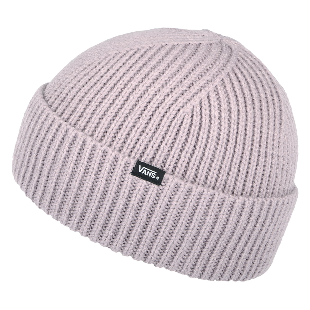 The Vans Women's Shorty Beanie Hat in dusky pink is made of a soft acrylic yarn. This fisherman style beanie features a ribbed pattern and a Vans tab sewn to the lip of the cuff.