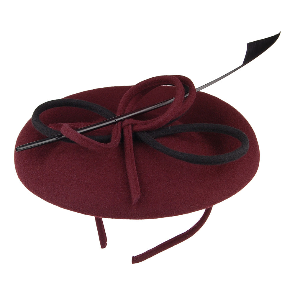 The Whiteley Arwyn Disc Fascinator in mulberry is the perfect style for any formal occasion. The body of the fascinator is made of 100% wool and there is a swirl and feather decoration on top. An alice band affixed to the underside allows the fascinator to fit most head sizes comfortably.